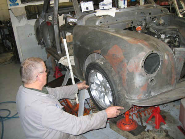 Eventually, it was decided to build most of the suspension from scratch, but these Aussie Cortina stubs were used. Mal trials a borrowed front wheel (15") for position, to keep within the bodywork. A second-hand BMW power steering rack seemed ideal, suggested by the local power steering specialists, Porana Rd - another racer - Pete Sutcliffe... This was a comfortable choice, given the short term relationship that BMW had with MG Rover... At that stage, I thought that power steering may be required so provision was there from the beginning. Once again, much later, this proved to have been a mistake, but as with the hubs, for the time being, work continued on the basis that all the basic thinking was sound. I was quite smug at the thought that the BMW rack with the facility to be powered if required, was smart long term thinking, but getting the rack totally overhauled just added yet more cost.