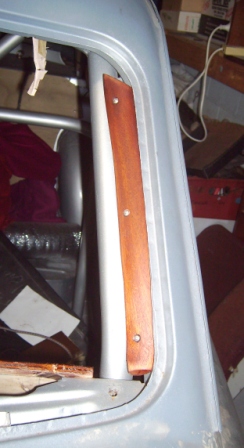 The original rear door cappings are also shown as a comparison. The top capping in the picture is the first one done some months ago. The lack of gloss on the second capping is obvious from this picture and it is only after about ten coats that the gloss has any depth, as the wood absorbs the polish slowly and each coat is very thin. Two pot varnish is quicker and thicker... and probably more durable.